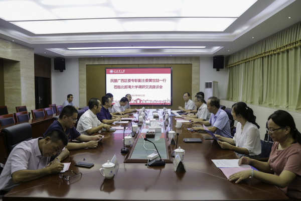 9月22日,民盟广西区委专职副主席黄世喆一行到我校就民盟基层组织发展建设开展座谈交流,校党委常委、副校长陈磊出席座谈会。
