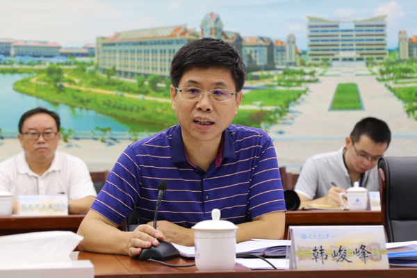 在办公楼523会议室,韩峻峰对黄定嵩一行的到来表示热烈欢迎,并对钦州市人大政协的各位领导和专家长期以来一直对学校的关心、支持和帮助表示感谢。