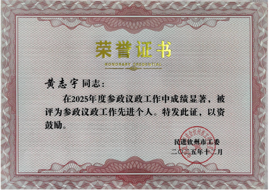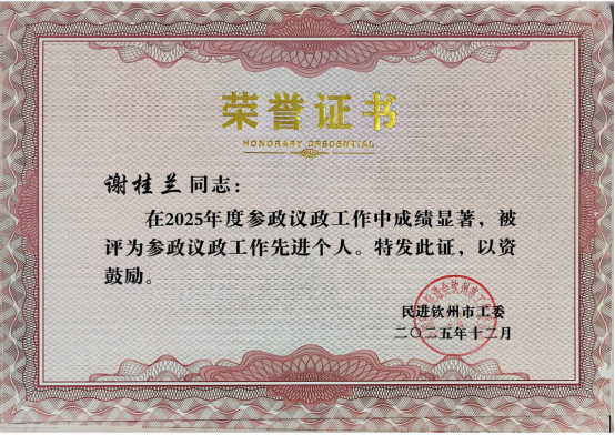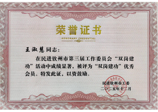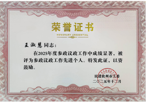 近日,民进钦州市工委发布《关于表彰2025年度先进集体和先进个人的决定》。其中,北部湾大学民进文管支部荣获“反映社情民意信息工作先进集体”荣誉称号。同时,我校多位民进会员教师获得先进个人表彰:黄志宇、王淑慧、谢桂兰等三位教师荣获参政议政工作先进个人荣誉称号;王淑慧、吴海萍、覃伟荣等三位教师获得“双岗建功”优秀会员荣誉称号;黄志宇荣获反映社情民意信息工作先进个人荣誉称号。
