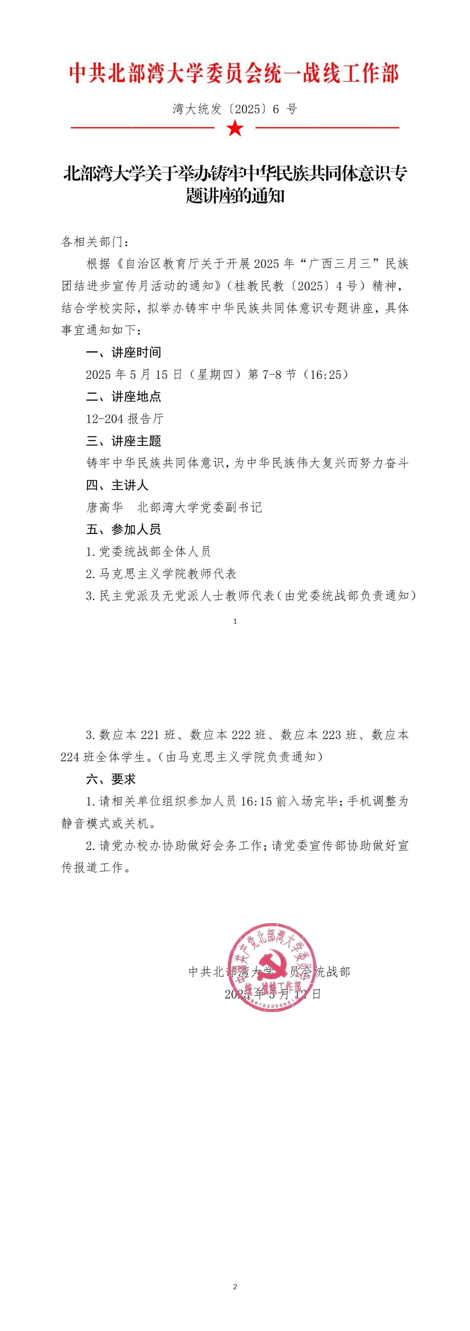 北部湾大学关于举办铸牢中华民族共同体意识专题讲座的通知(湾大统发〔2025〕6号)