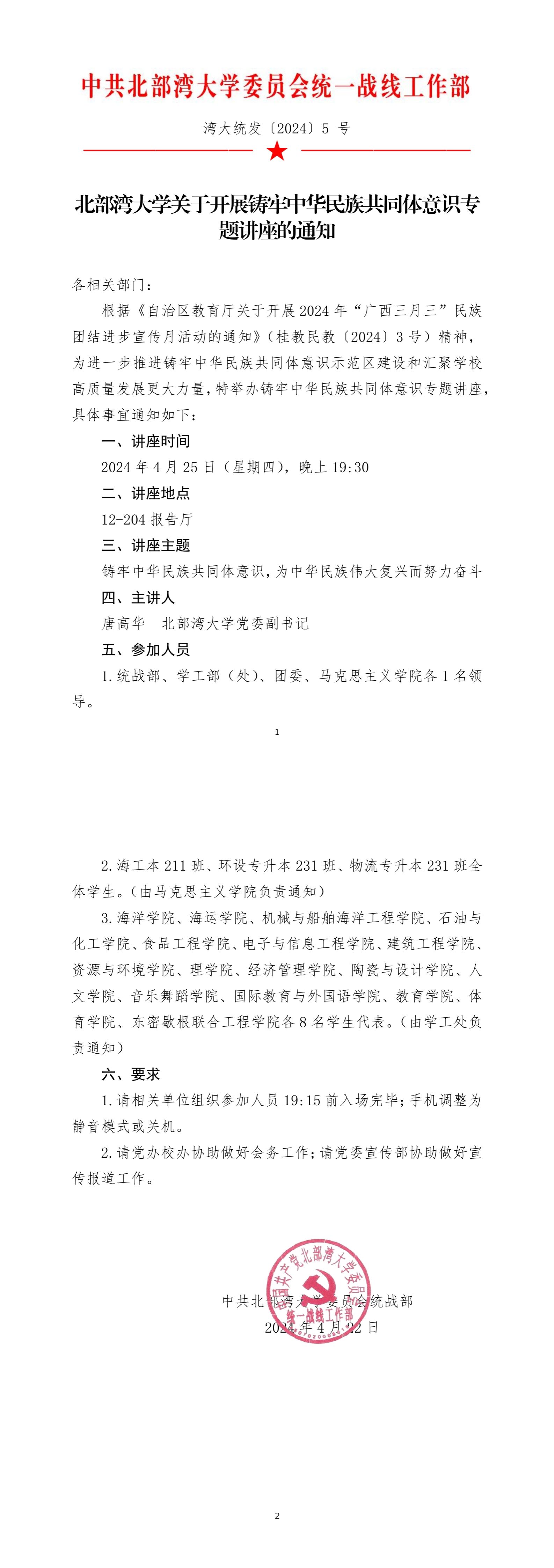 北部湾大学关于开展铸牢中华民族共同体意识专题讲座的通知(湾大统发〔2024〕5号)